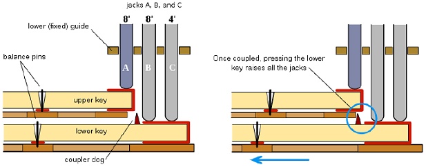 (Figure 4. Double keyboard coupling mechanism) For quills to be used to pluck the strings on the harpsichord there is quite a bit of preparation to make them work properly. Before being inserted into the jack, a suitable quill must be selected. When using crow quills, only the primary flight feathers are used. The barbs are then removed from the feathers, leaving only the bare shafts of the quills.
